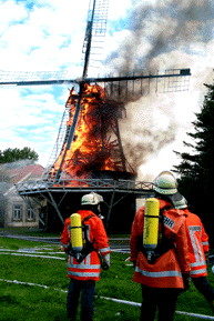 Ein Nachbar hatte morgens Rauch aus der Mühle austreten sehen und löste sogleich den Notruf aus. Bürgermeister Gerd Freese, der zugleich Vorsitzender des örtlichen Mühlenvereins ist, konnte mit Unterstützung noch einige wenige Inventarstücke herausholen, bevor der komplette hölzerne Aufbau über dem Achtkant in voller Ausdehnung in Flammen stand. Schnell war den Blauröcken klar, dass die Mühle trotz der neun eingesetzten Rohre nicht mehr gerettet werden konnte. So bezogen sich die Maßnahmen zusätzlich auf die Sicherung des alten Müllerhauses und des in der Nähe befindlichen Landhandels. Auch die Drehleiter aus Wittmund wurde angefordert, die Landesstraße blieb für etwa eine Stunde komplett gesperrt. "Bei der Ursache handelt es sich einwandfrei um einen Kurzschlusses in der Elektroinstallation", erklärte gestern Wolfgang Memenga, der Leiter des zentralen Kriminaldienstes bei der Polizei Wittmund. Nach Aussagen von Augenzeugen war das Feuer im ersten Stockwerk des Galerie-Holländers ausgebrochen. Nachdem vor sechs Jahren schon einmal 400.000 Mark investiert worden waren, sollten hier im Herbst eigentlich weitere Sanierungsarbeiten beginnen. (Foto links: Kiese)