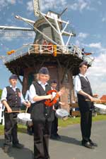 Vor fünf Jahren setzte der Schweindorfer Harm Dittmer, selbst Mühlenwart beim Schweindorfer Mühlenverein, die Idee eines Schweindorfer Spielmannszuges in die Tat um. Heute ist der Spielmannszug zu einem Aushängeschild und Werbeträger nicht nur für den Mühlenverein, sondern auch für die kleine Gemeinde Scheindorf und das gesamte Holtriemerland geworden. Bei zahlreichen Veranstaltungen in Ost-Friesland und auch über seine Grenzen hinaus hat der unverwechselbare Sound der Schweindorfer Spielleute schon für Aufsehen und Freude gesorgt. Nicht zuletzt die große Resonanz auf die Einladung zur Geburtstagsfeier spiegelte diesen Bekanntheitsgrad wieder.